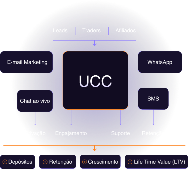 Com o Módulo UCC, sua corretora centraliza e automatiza e-mails, WhatsApp, SMS e campanhas de marketing em um único sistema projetado para ativar traders, ampliar afiliados e multiplicar depósitos.